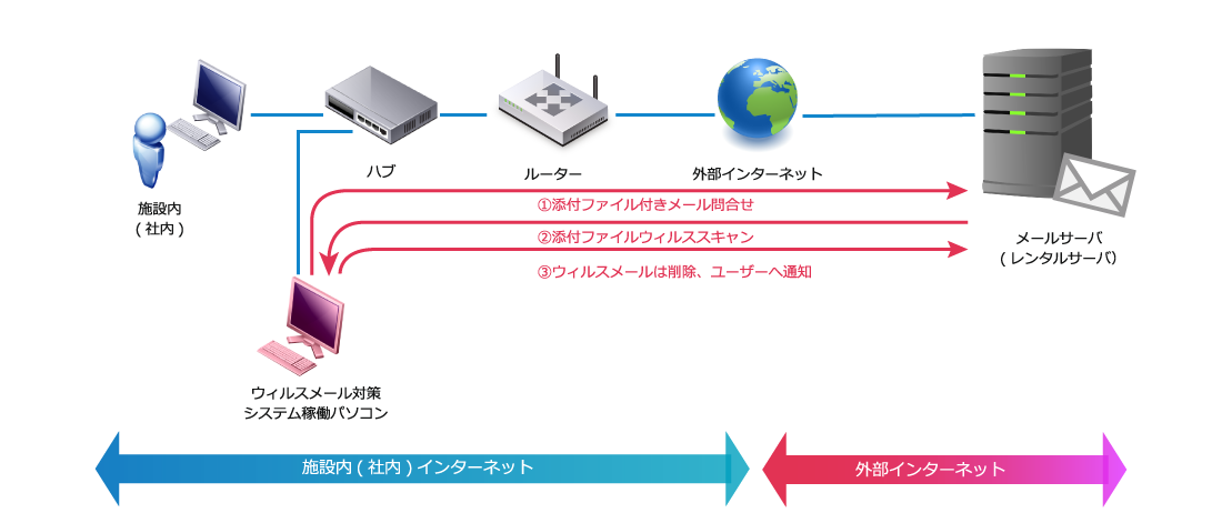 4. 4. システムが登録されたメールアカウント情報を元にメールサーバへ接続し、添付ファイル付きメール対象にウイルスチェックを行います。