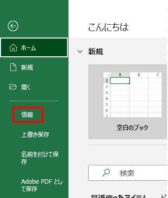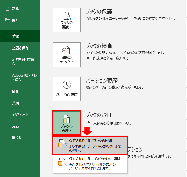 3.情報メニューの「ブックの管理」から「保存されていないブックの回復」を選択します。