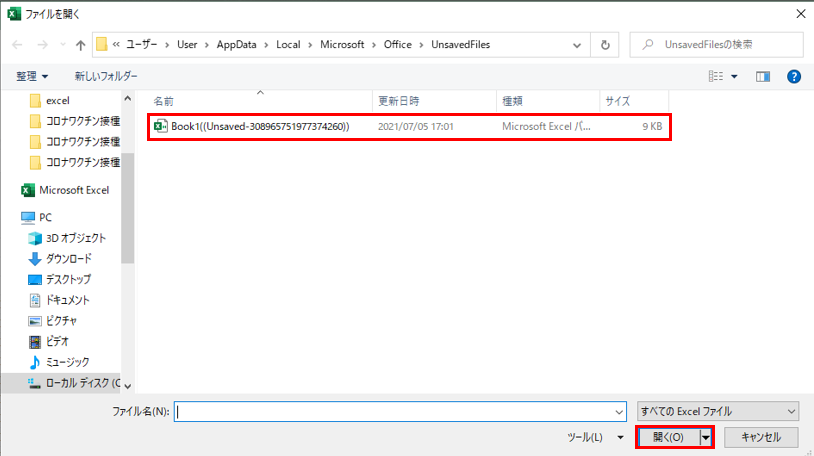 4.保存されていないファイルの一覧が表示されるので、復元したいファイルを選択して「開く」をクリックします。