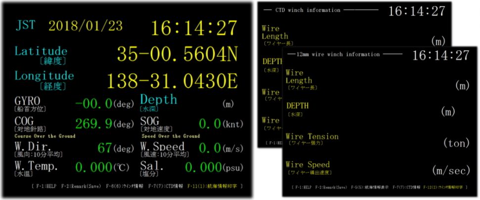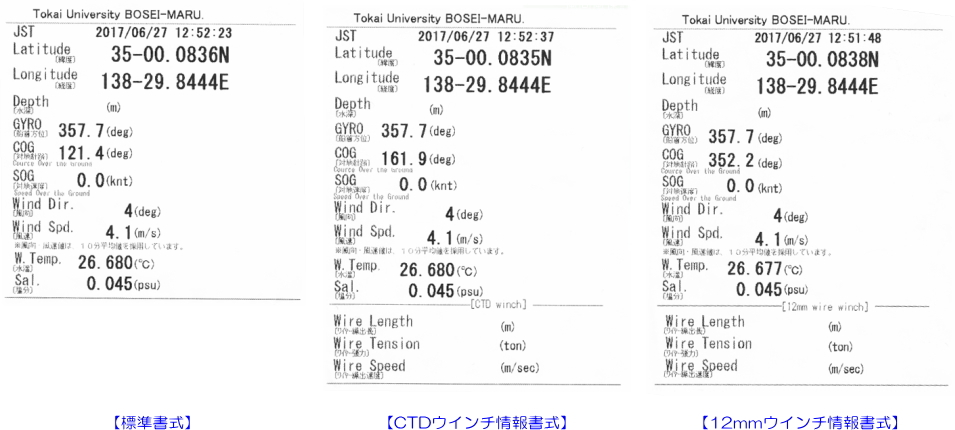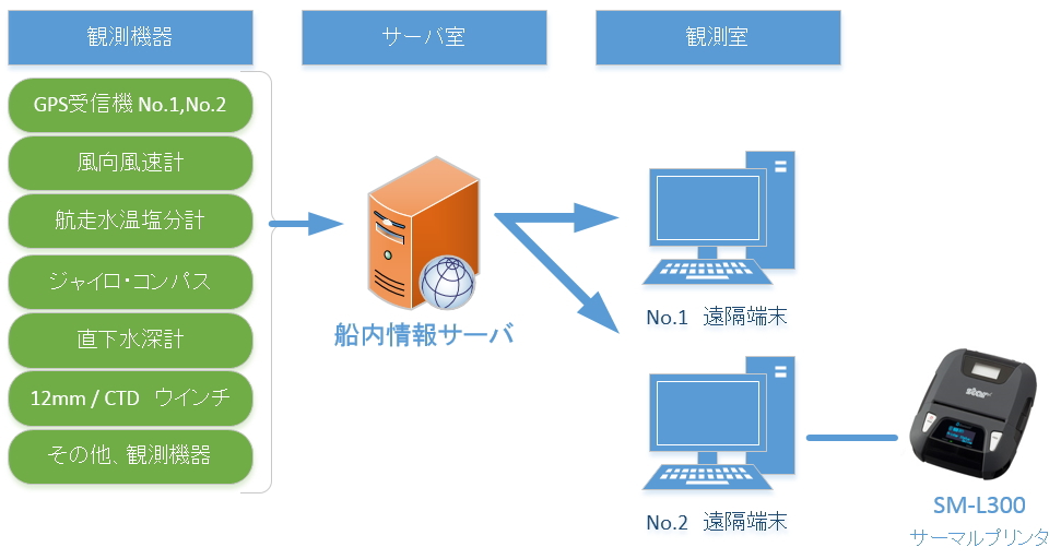 東海大学様の海洋調査研修船・望星丸では、各観測機器から得られた情報を船内情報処理サーバにて編集処理を行い、船内LAN(ネットワーク)を通じてネットワーク上の端末に情報を発信しています。遠隔の端末では、モバイルプリンタ(レシートタイプ)が接続されており、海洋観測で観測機を海中に投下した時など端末のキー操作によりその時点の本船位置、動静情報(船首方位、針路、船速)や風や気温などの気象情報、ウインチの情報などをモバイルプリンタで印刷することができます。