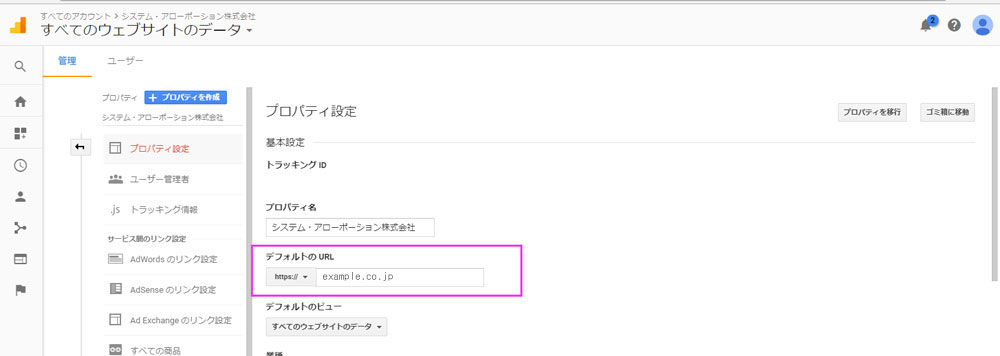“プロパティ”-“プロパティ設定”から、”デフォルトのURL” で “http”を”https”に変更します。